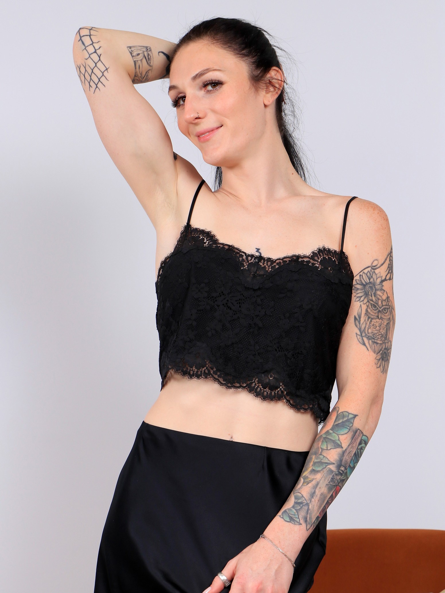 If you saw the comfortable Nikki North in her previous set, this is the night time Nikki North, and a little more daring, a lot more demanding and she's dressed for fun and visuals with the black lingerie setting off her pale smooth skin perfectly, the only color coming from her lips, her tatts and... Read More in Members Area